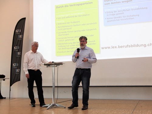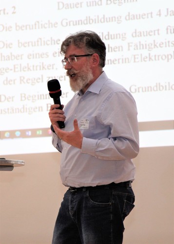 Nach einer kurzen Pause präsentierten Ralph Voggenhuber, Berufsinspektor Mittelschul- und Berufsbildungsamt, und Edgar Frei das Thema «Begleitung und Unterstützung Lernende» und griffen dabei auch die Formalitäten der Lehrauflösung auf. Darauffolgend gab André Moser, Vertreter PK12, einen Ausblick auf das Qualifikationsverfahren 2019. Bruno Gassmann machte in diesem Zusammenhang auf das Absenzgesuch Militär für die Diplomfeier sowie die neuesten politischen Entwicklungen zum Thema Militär aufmerksam und ging auf die Begleitung von Lernenden bei der Einsichtnahme QV ein. In der letzten Themenauswahl wurde mittels Einspielung von Videointerviews einerseits die Sichtweise von zwei Repetenten aufgezeigt, andererseits aber auch die Ansichten der Unternehmerseite. Im nachfolgenden Erfahrungsaustausch konnten sich alle Teilnehmenden zum Thema äussern und Ihre Fragen und Erlebnisse einbringen. Ralph Voggenhuber erläuterte nach der Diskussion die Zusatzlehren, Perspektiven und das Vertragswesen. Nach dem Testimonial-Bericht zum Kurs «Teamleiter VSEI» präsentierte Paul von Euw die neuen Wegleitungen und Prüfungsordnungen BP/HFP.