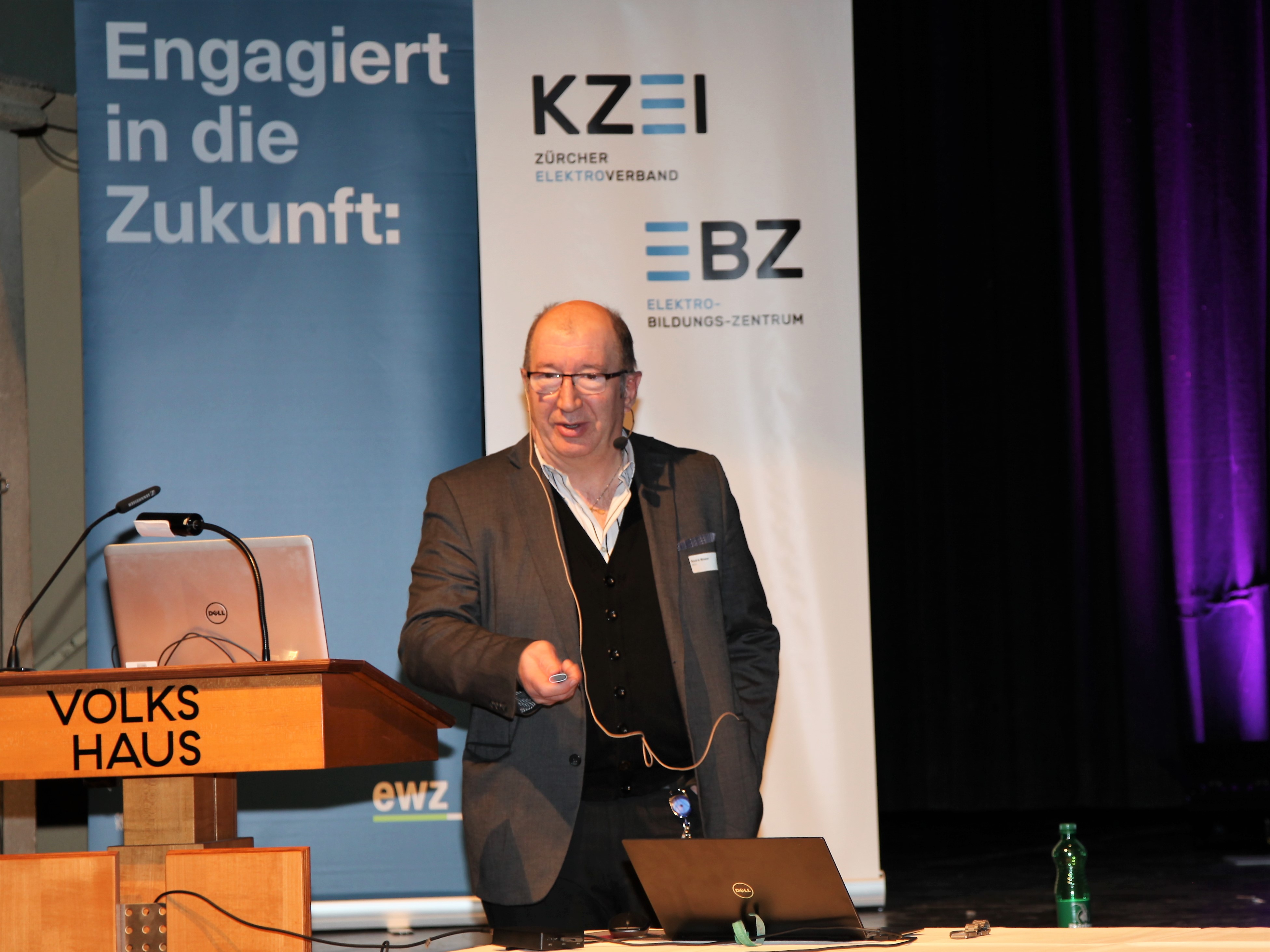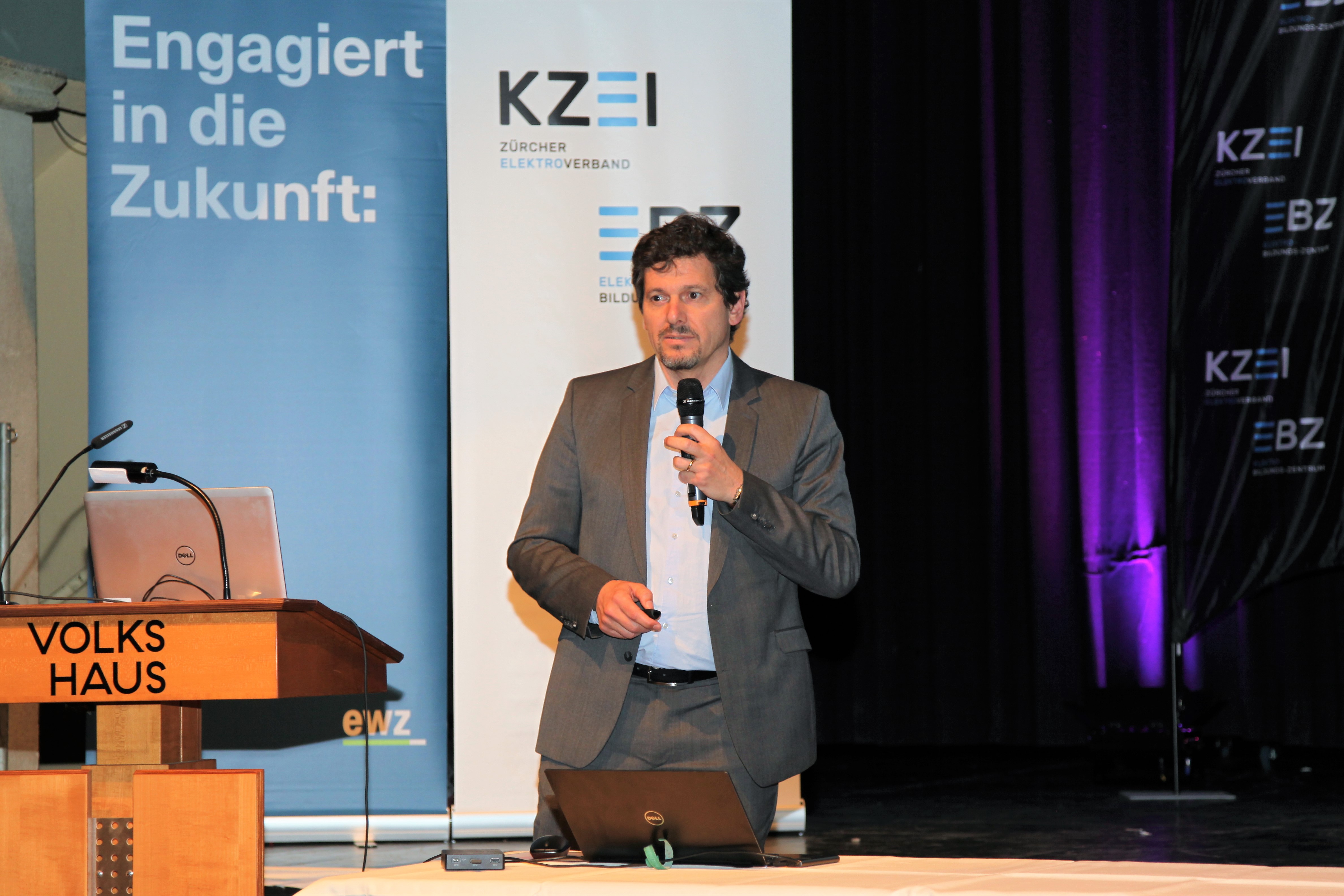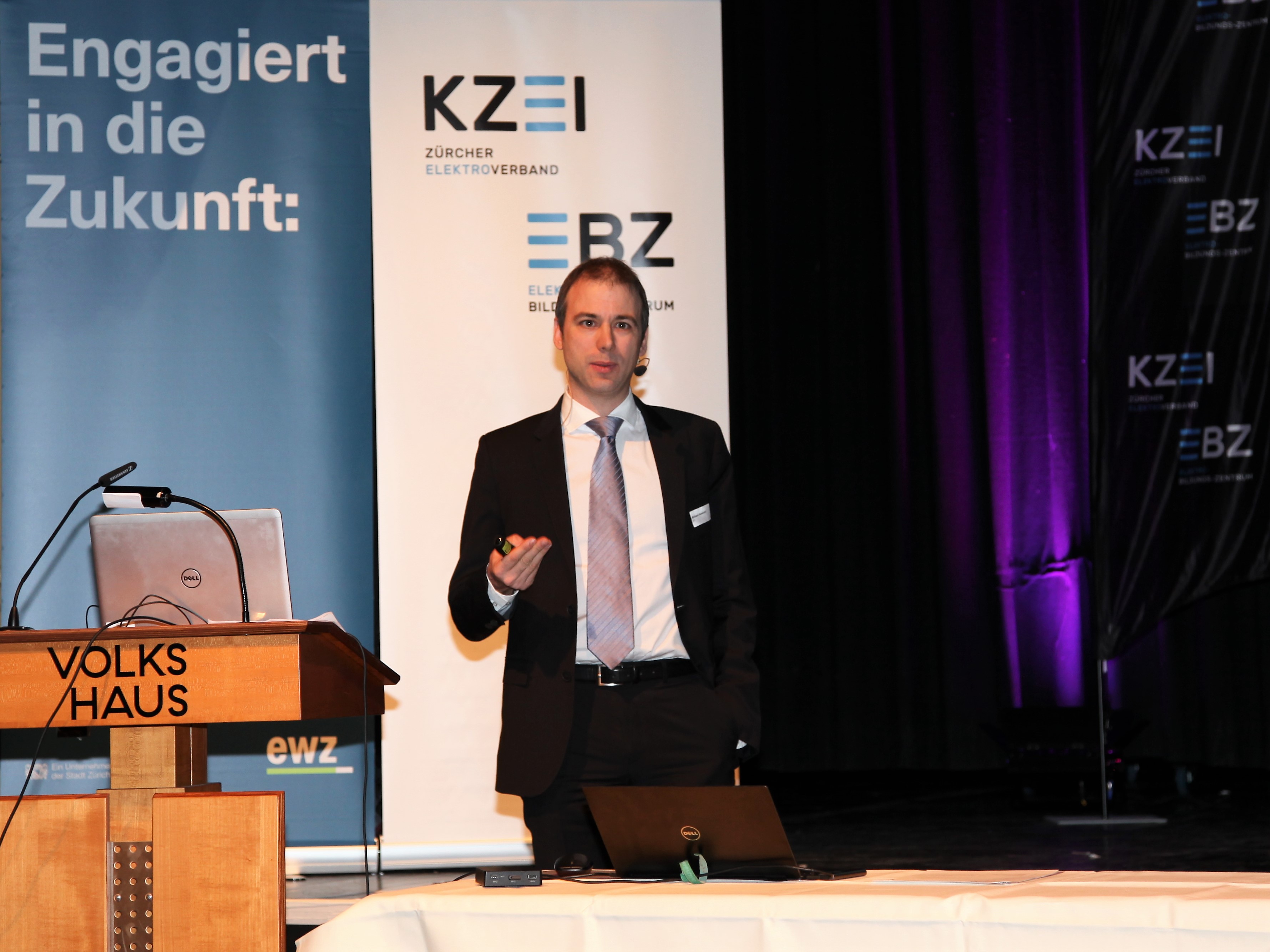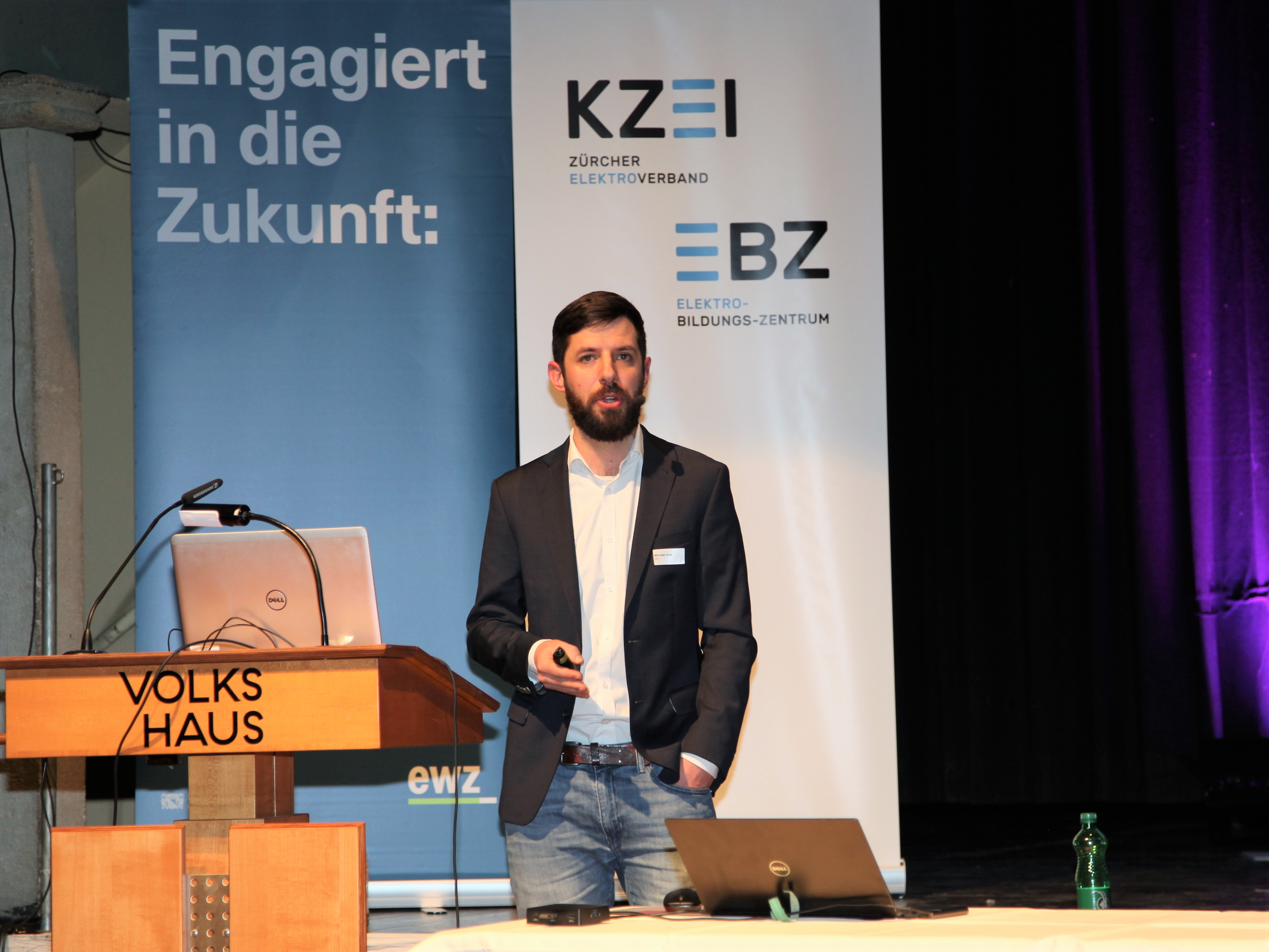 Eduard Sturny, Leiter Technik und Sicherheit des ewz, eröffnete die Tagung pünktlich um 13.30 Uhr und begrüsste die zahlreichen Teilnehmenden. Im Anschluss folgten die Vorträge von Benedikt Loepfe, ewz, zur Versorgungssicherheit in Zukunft sowie Informationen zur Technik und Sicherheit durch Eduard Sturny. Im Referat «Wie werde ich BIM ready?» erklärte Stefan Wüst, Bouygues E&S InTec Schweiz AG, die BIM-Methode und zeigte auf, wie man sich auf die Digitalisierung im Bauwesen vorbereitet. David Keller, Chefexperte Elektroinstallateure am Prüfungsort Effretikon, ging anschliessend auf die BiVo 2015 und Ihre Neuerungen ein. Als letzter Referent vor der Pause trat Richard Amstutz, ESTI, auf die Bühne und klärte die Teilnehmenden in seinem Vortrag über die rechtliche Seite eines Zusammenschlusses zum Eigenverbrauch auf.